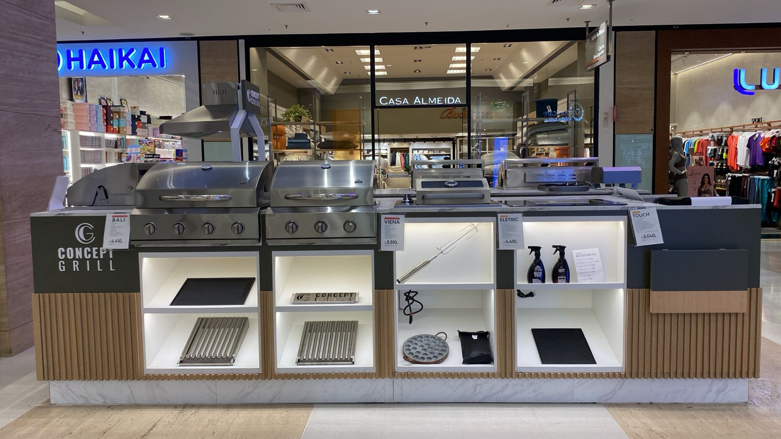 A Concept Grill é especializada em produtos para churrasco e churrasqueiras, oferecendo uma linha completa de equipamentos e acessórios que unem praticidade, tecnologia e design. No quiosque, é possível encontrar churrasqueiras portáteis, elétricas, a gás, além de espetos, grelhas, tábuas, facas e diversos itens que tornam a experiência do churrasco mais funcional e saborosa. Ideal para quem valoriza momentos de confraternização com qualidade e estilo.
