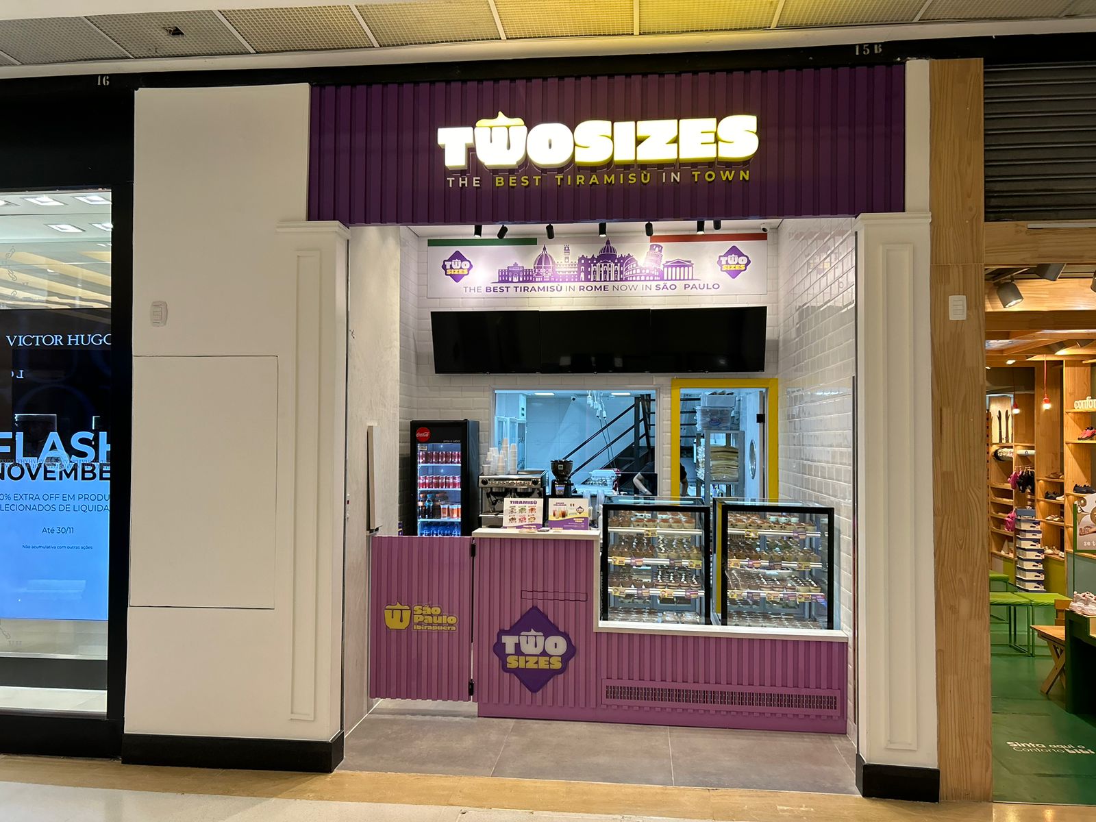 A Two Sizes chegou ao shopping trazendo sobremesas irresistíveis e muito sabor em cada colherada. Conhecida por seus tiramisùs famosos em duas porções — para provar ou para se esbaldar — a marca oferece doces cremosos, café de qualidade e um espaço acolhedor perfeito para uma pausa deliciosa durante o dia.