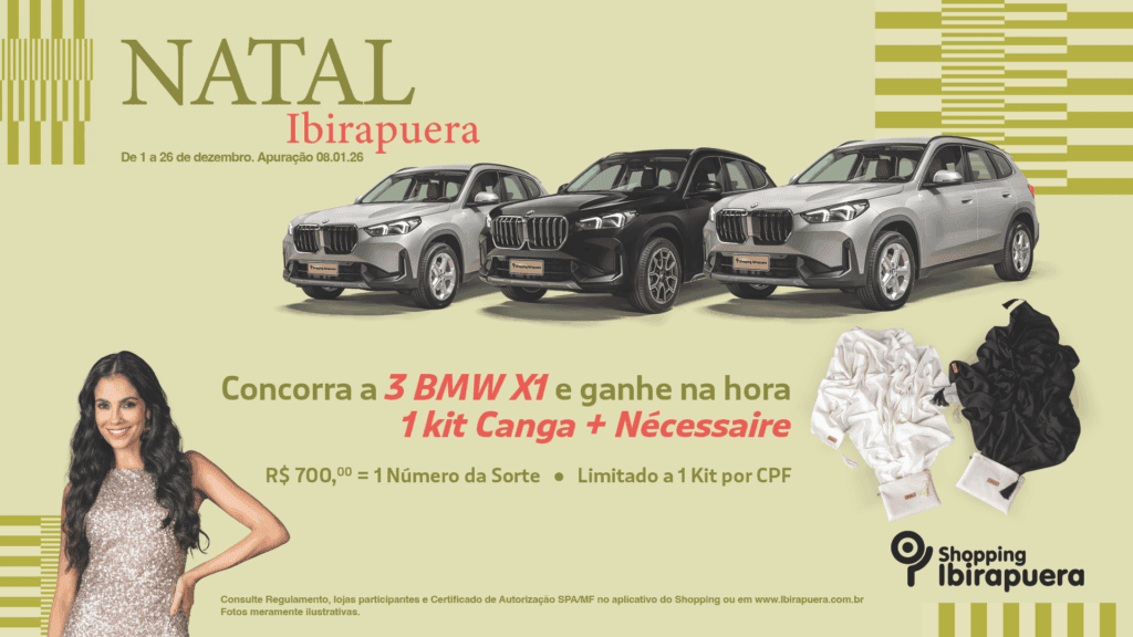 Serão aceitas para troca por números da sorte, quaisquer notas e cupons fiscais de compras realizadas no período da promoção, de 01/12/2025 a 26/12/2025, nas lojas e quiosques participantes do Shopping Ibirapuera.